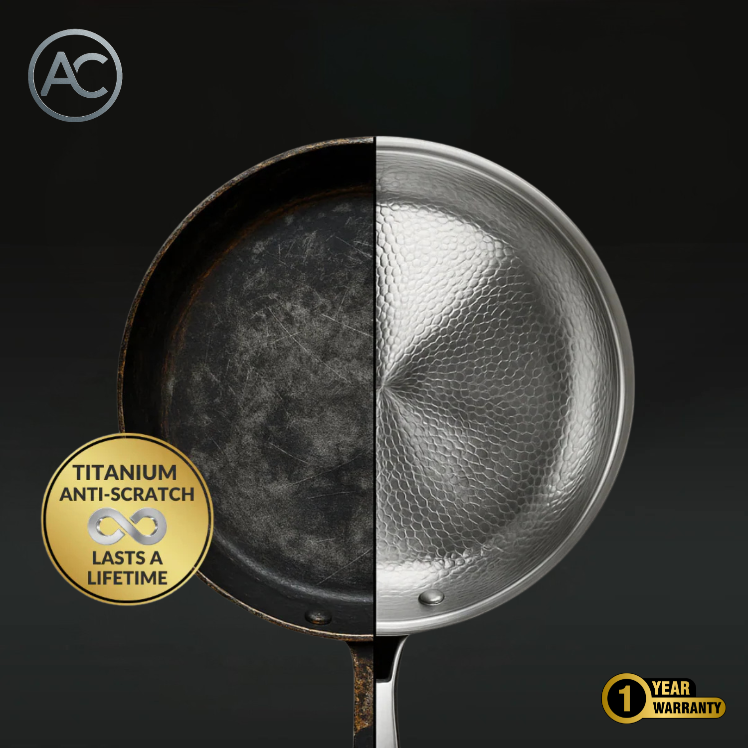 Forged from premium, food-safe titanium, this high-walled pan is completely free from harmful coatings, toxins, and chemical treatments. Its refined titanium surface delivers exceptional scratch resistance, rapid and even heat distribution, and dependable performance built to last a lifetime.